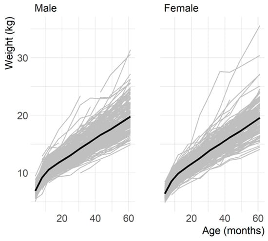 Weight trajectories from measurements of 544 children taken between 4 and 61 months of age, and mean weight highlighted in black.