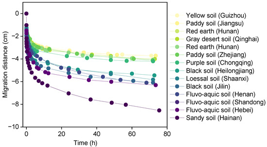 The migration kinetics could be satisfactorily described with the third-order exponential equation (R2 > 0.99), and the equilibrium migration distance ranged from 3.42 cm (Guizhou yellow soil) to 8.82 cm (Hainan sandy soil) (Table S6). The equilibrium migration distance of diesel in fourteen types of soils is as follows: sandy soil > sandy loam soil > sandy clay loam soil > clay loamy soil > sandy clay soil, which further confirmed that soil structure characteristics are key factors that lead to the migration distance of diesel under spill condition [38].
