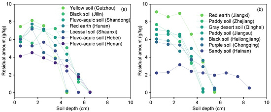 Figure 3 showed the variation of the residual amount of diesel after migrating 72 h in fourteen types of soils. The residual amount of diesel in seven types of soils gradually increased first and then decreased with the increase in soil depth (Hunan red earth, Shandong fluvo-aquic soil, Shaanxi loessal soil, Guizhou yellow soil, Henan fluvo-aquic soil, Hebei fluvo-aquic soil, and Jilin black soil) (Figure 3a). For example, the maximum residual amount of diesel in Hunan red earth, Shandong fluvo-aquic soil, Shaanxi loessal soil, and Guizhou yellow soil were observed at 1.5 cm, the values were 7.8, 7.4, 7.2, and 8.2 g/kg, respectively. A similar phenomenon was reported by previous studies, which was attributed that the migration rate gradually decreased with the increase in soil depth [38,39]. Meanwhile, the high viscosity of diesel is also an important factor for its interception by the upper layer of soil [40]. As shown in Figure 3b, the residual amount of diesel in gray desert soil (Qinghai), purple soil (Chongqing), paddy soil (Zhejiang and Jiangsu), black soil (Heilongjiang), and red earth (Hunan) decreased with the increase in soil depth, even the residual amount of diesel decreased rapidly with the soil depth exceeding 2.5 cm. Due to the larger particle size and porosity, the residual amount of diesel is uniformly distributed in Hainan sandy soil. Since the shortest migration distance of diesel in fourteen types of soils was 3.45 cm, only the residual amount of diesel in the 0-3 cm soil layer were focused on in this study. In the 0–1 cm soil layer, the residual amount of diesel (Y1) ranged from 2.8 g/kg (Hainan sandy soil) to 7.7 g/kg (Zhejiang paddy soil). In the 1–2 cm soil layer, the residual amount of diesel (Y2) in nine types of soils is more than 6.0 g/kg, and the average concentration was 1.2 times that of diesel in the 0–1 cm soil layer. In summary, the residual amount of diesel in fourteen types of soils was as follows: sandy clay loam soil > clay loamy soil > sandy clay soil > sandy loam soil > sandy soil.