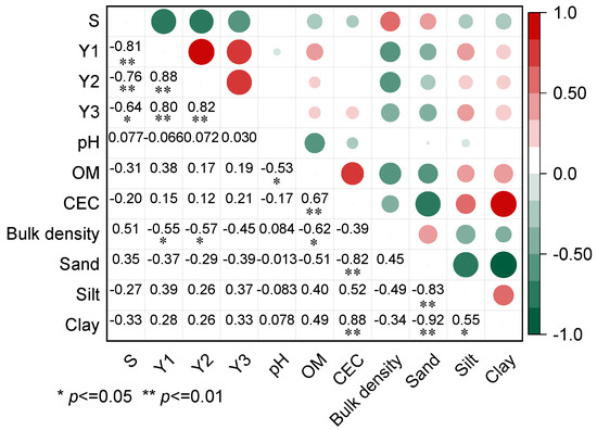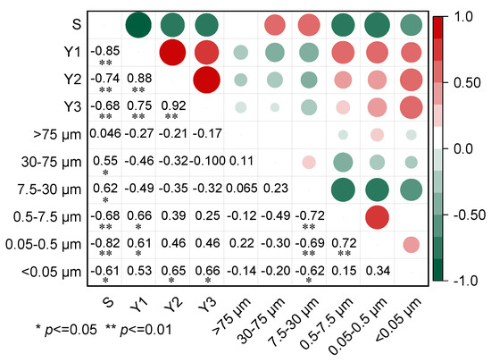 Correlation analysis was conducted between the migration distance and residue amount of diesel in the 0–3 cm soil layer and the basic physicochemical properties of soil (Figure 4). Residual amounts of diesel in the 0–1 cm and 1–2 cm soil layers have a negative correlation with soil bulk density (R2 > 0.55, p ˂ 0.05). In comparison, there is a poor correlation between migration distance or residue amount of diesel in the 2–3 cm (Y3) soil layer and other basic physiochemical properties (e.g., organic matter content and cation exchange capacity). This result indicated that during the spill of diesel, the chemical properties of soil have little effect, while soil structure characteristics have an obvious effect on the migration distance and residue amount of diesel in unsaturated soil. The phenomenon was inconsistent with the current results that soil organic matter is a key factor in determining the adsorption of organic pollutants by soil [42,43], which was attributed to the fact that diesel with a fast infiltration rate is hard to fully interact with the soil [44]. Han et al. [20] found that although two types of soils with the same soil porosity and organic matter content, soil with high clay content possessed more micropores, resulting in the higher residual amount of NAPL in the soil.