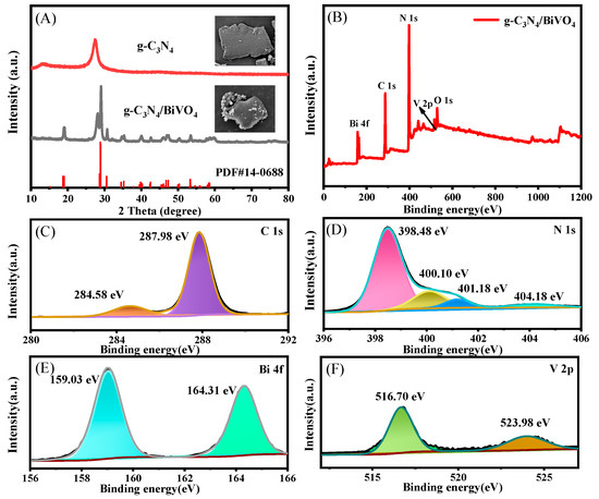 The morphologies of the synthesized g-C3N4/BiVO4 were observed by SEM. As seen from Figure 1A, the g-C3N4 showed the appearance of smooth sheet structure. After the introduction of BiVO4, the irregular flower-like BiVO4 was directly anchored onto the surface of g-C3N4, confirming that the smooth surface of g-C3N4 could provide a suitable platform for the decoration BiVO4, and further indicating that the electrode material was successfully prepared. Figure 1A also exhibited the XRD patterns of g-C3N4 and g-C3N4/BiVO4 to characterize the crystalline features. As for g-C3N4, two main peaks around 13.1° and 27.3° were observed, which could be attributed to the (100) in-plane structural packing of heptazine units and (002) interlayer stacking of the conjugated aromatic segment [29]. After the BiVO4 decoration, the peaks of g-C3N4/BiVO4 were matched with the XRD standard card of BiVO4 (PDF#14-0688). Additionally, the diffraction peaks at 18.7°, 28.8°, 30.4°, 34.6°, 35.0°, 39.7°, 42.5°, 45.8°, 46.5°, 47.0°, 50.2°, and 53.1° are ascribed to the (1 1 0), (1 2 1), (0 4 0), (2 0 0), (0 0 2), (2 1 1), (1 5 0), (1 3 2), (0 4 2), (2 0 2), (1 6 1), and (1 5 2) diffraction phases of BiVO4, respectively [29]. Additionally, the peaks of g-C3N4 in the g-C3N4/BiVO4 were still retained but noticeably weakened owing to its low XRD intensity, and the existence of g-C3N4 in the composite could be verified by other characterization.