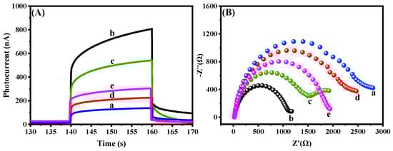 (A) Photocurrent responses and (B) electrochemical impedance spectra of (a) g-C3N4/FTO; (b) g-C3N4/BiVO4/FTO; (c) g-C3N4/BiVO4/Aptamer/FTO; (d) g-C3N4/BiVO4/Aptamer/BSA/FTO; (e) g-C3N4/BiVO4/Aptamer/BSA/TC/FTO.