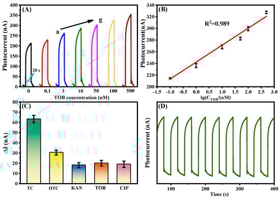 To confirm the detection capacity of the PEC aptasensor, various concentrations (0, 0.1, 1, 10, 50, 100, 500 nM) of TC were studied under the optimal conditions (the specific optimization results were detailed in Figure S2). As shown in Figure 3A, the photocurrent intensity of the PEC aptasensor was enhanced with the concentration of TC increasing. Additionally, the linear equation could be fitted to I (nA) = 29.0622 lg (C/nM) + 242.209 (R2 = 0.989) in the range of 0.1-500 nM with a limit of detection (LOD) of 0.06 nM (S/N = 3) [42], which was below the maximum residue limits (MRLs) of TC (900 nM) in milk set by the US Food and Drug Administration [43]. Additionally, compared with most other methods reported previously, such as colorimetric, fluorescence, electrochemistry, and electrochemiluminescence (Table 1), the PEC aptasensor displayed excellent performance with a relatively lower detection limit and convenient operation.