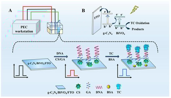 Scheme 1 depicted the working principle of the proposed PEC aptasensor. In this progress (Scheme 1A), an FTO electrode was sequentially decorated by the g-C3N4/BiVO4, CS, GA, TC aptamer probes, BSA, and TC. Here, the g-C3N4/BiVO4 heterojunction was designed successfully owing to the well-matched energy level of g-C3N4 and BiVO4 (Scheme 1B), which exhibited enhanced separation of photogenerated carriers and an improved, attractive, and stable photocurrent signal, indicating that it is feasible to fabricate more an accurate PEC aptasensor [29,36]. Moreover, the aptamer probes were tightly immobilized onto the surface of g-C3N4/BiVO4/FTO, due to the covalent bonding interaction (GA was connected to both the amino-rich CS and the amino-functionalized TC aptamer probes). Remarkably, π-π stacking and covalent bond interaction are common methods to fix aptamer probes onto the sensor surface. The π-π stacking have merits of simple operation, low cost, and short reaction time. However, to a certain degree, the covalent bond interaction appears to be more stable, because this method could make the aptamer probes tightly bonded to the electrode and not easily fall off, so that the prepared aptamer sensor is able to present relatively stable results [5,15]. Notably, after the decoration of the TC aptamer probes, the photocurrent was decreased due to the steric hindrance of biomolecules. Then, the BSA was dropped onto the modified electrode to prevent non-specific adsorption. When there is existence of TC, the formation of aptamer–TC complexes brought about an increased photocurrent due to the oxidation by the holes accumulated on the g-C3N4/BiVO4, and further facilitated electrons transfer [30]. Specifically, the TC molecules could be oxidized directly by photogenerated holes in the valence band (VB) of BiVO4. Subsequently, the holes were consumed, which inhibited the recombination of photogenerated electrons/holes, resulting in the accumulation of more free electrons on the CB of g-C3N4, which were transferred to the electrode to generate an increased photocurrent signal (Scheme 1B). Therefore, a “signal on” PEC aptasensor for highly stable determination of TC was constructed.
