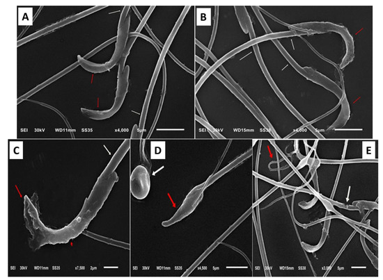 Representative images of scanning electron microscopy showing examples of sperm cell normal and abnormal. (A,B) normal sperm head (red arrow), normal middle piece (white arrow). (C–E) abnormal sperm; (C) damaged acrosomal and plasma membrane (red arrow), (D) small head (red arrow), and round head abnormalities (white arrow), (E) coiled tail (red arrow) and damaged middle piece (white arrow).
