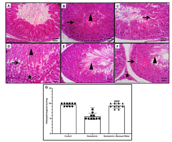 Representative photomicrographs of testis cross-section from the control and experimental groups. (A) The control groups displayed a compact and regular arrangement of spermatogenic cells and the presence of variable stages of maturation with many mature spermatozoa. (B,C) The gentamicin group showed distorted testicular architecture with numerous spermatogenic germ cell layers necrosis (mostly in spermatids and spermatozoa) (thin arrows), and intraluminal clumped sloughed germ cells admixed with necrotic sperm (arrowhead). (D) Gentamicin group showing testicular degenerative changes represented by severe spermatogenic vacuolation mostly in spermatids cells (thin arrow) with spermatogonial pyknosis (star) and marked eosinophilic necrotic debris closed the tubular lumen (arrowhead). (E,F) Zamzam group shows normal histological arrangement regular arrangement of spermatogenic cells and the presence of variable stages of maturation with a considerable number of mature spermatozoa, few, occasional vacuolated spermatogenic cells (thin arrow), and numerous intraluminal mature sperm cells (arrowheads). Leydig cells were normal (star). (G) Histogram of testicular histopathological scoring of different groups; values reported as mean ± standard deviation. ANOVA in one direction with Tukey post hoc analysis showing significant differences over the control group: *** p < 0.00, significant versus the control group. The gentamicin group: ### p < 0.00. Image magnification 100× (A,C,E) ×400 (B,D,F) (B,D,F) bar 50.