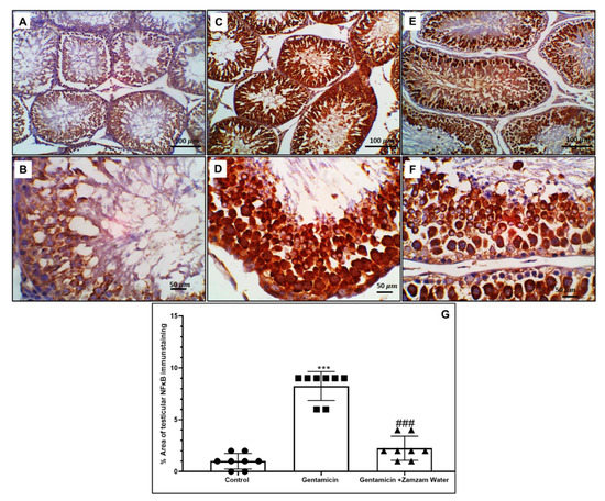 Typical immunohistochemistry staining of NF-B expression in experimental and control testicle groups. (A) Control group showing diffuse minimal expression of NF-κB in spermatogenic cells and interstitial Leydig cells, (B) higher power showing few cytoplasmic expressions of NF-κB. (C) Gentamicin group showing the diffuse, extensive expression of NF-κB in spermatogenic cells and interstitial Leydig cells. (D) higher power showing intense cytoplasmic and nuclear expression in spermatocytes with more expression in the acrosomal cap of spermatids. (E) The Zamzam group showing a moderate decrease in NF-κB expression in seminiferous tubules with few expressions in interstitial Leydig cells. (F) The Zamzam group higher power showing the localization of NF-κB within spermatogenic cells with scant expression in spermatogonia, less cytoplasmic expression in spermatocytes and more expression in the acrosomal cap of spermatids without nuclear expression. (G) Testicular NF-κB immunostaining histogram percent area; values reported as mean ± standard deviation. ANOVA in one direction with Tukey post hoc analysis showing significant differences over the control group: *** p < 0.00, significant versus the control group. The gentamicin group: ### p < 0.00, image magnification 100× (A,C,E) ×400 (B,D,F) (B,D,F) bar 50.
