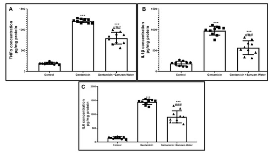 Effect of Zamzam water treatment on proinflammatory markers by ELIZA: (A) TNFα, (B) IL1β, and (C) IL-6 in different groups of rats. Values reported as mean ± standard deviation. ANOVA in one direction with Tukey post hoc analysis showing significant differences over the control group: *** p < 0.00, significant versus the control group. The gentamicin group: ### p < 0.00.