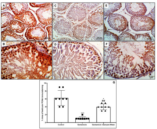 PCNA immunoexpression in the seminiferous tubules was considered an indicator for spermatogenesis; the immunoexpression of PCNA in control and Zamzam water were significantly (p < 0.00) and (p < 0.01) enhanced in relation to the gentamicin group (Figure 9), this indicates the good impact of Zamzam water on the spermatogenesis process as a result to its antioxidant character.