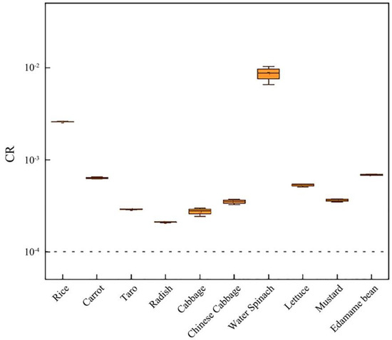 In the farmland researched, the total carcinogenic risk of different farmland crops exceeded the acceptable limit of 10−6–10−4, so there was a serious carcinogenic risk for crops in this area. As shown in Figure 1, the carcinogenic risk of water spinach (CR = 8.58 × 10−3) and rice (CR = 2.58 × 10−3) was relatively high. In addition, the carcinogenic risk of edamame beans (CR = 6.84 × 10−4) and carrots (CR = 6.35 × 10−4) also existed to some extent. The carcinogenic risk of Cr in the edible part of crops followed the sequence of Water spinach > Rice > Edamame bean > Carrot > Lettuce > Mustard > Chinese cabbage > Taro > Cabbage > Radish. On the whole, the carcinogenic risk of different types of crops was shown as food crops > legume crops > leafy crops and root-tuber crops.