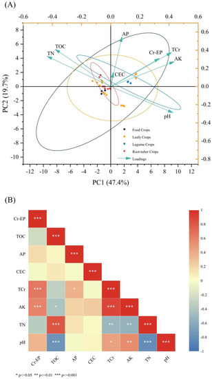 Principal component analysis (PCA) (A) and correlation analysis (B) for soil basic physicochemical properties, total Cr in soil, Cr bioaccumulation in the edible part of different crops. TCr: Total Cr in soil, Cr-EP: Cr in the edible part.