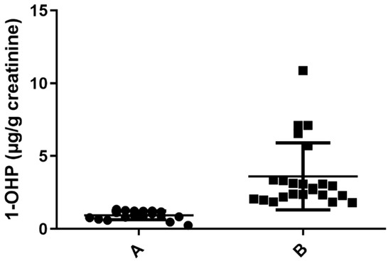 PAHs are generated during the incomplete combustion of organic matter. To determine the level of exposure to PAHs, we evaluated the concentration of urinary 1-OHP as a biomarker of exposure to the hydrocarbon mixture, as previously shown [16,17]. We assessed 41 urine samples of healthy women who had a traditional stove inside their house and used wood as a biomass fuel for cooking. Normalized data and non-normalized data with urine creatinine concentration (geometric mean ± SD 1.46 ± 2.11 μg/g creatinine; 1.09 ± 1.68 μg/L) and percentiles are shown in Table 1. Interestingly, in PC25, a value of 0.84 μg 1-OHP/g creatinine was found, despite limit values of 0.463 μg 1-OHP/g creatinine for occupationally unexposed non-smoking individuals and 1.46 μg 1-OHP/g creatinine for the occupationally unexposed smoking population having been previously established [13]. Considering that the women included in our study were occupationally unexposed but were in contact with a source of pollutants due to incomplete combustion, we stratified the population into two groups: group A, including individuals with less exposure to PAHs (levels below 1.46 μg 1-OHP/g creatinine), and group B, including individuals with greater exposure (levels above 1.46 μg 1-OHP/g creatinine) (Figure 1). The collected biochemical and anthropometric data from the studied population showed statistical difference solely for 1-OHP by the multiple t-tests, as seen in Table 2. Other features of the population, such as age, glucose level, cholesterol, height, weight, etc., were not statistically significant, reaffirming that 1-OHP could be used to stratify people exposed to PAHs.