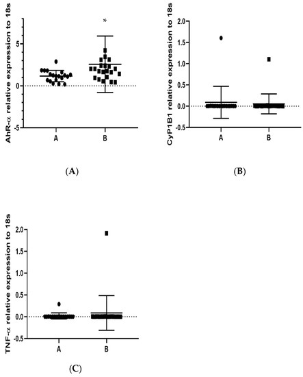 Determination by RT-qPCR of AhR, CYP1B1 and TNF-α relative expression in PBMCs in population (groups A and B) exposed to PAHs: (A) AhR, * p = 0.0412; (B) CYP1B1, p = 0.3570; and (C) TNF-α, p = 0.2476. 18s RNA was used to normalize the expressed transcripts. * p < 0.05.