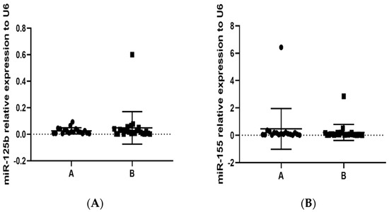 Determination by RT-qPCR of miR-125b and miR-155 relative expression in PBMCs in population (groups A and B) exposed to PAHs: (A) miR-125b, p = 0.2201; and (B) miR-155, p = 0.2227. Small nuclear RNA U6 was used for normalization.