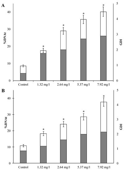 According to the experimental data shown in Figure 1A,B, short-term exposure to all studied concentrations of WAF-DF in both types of sand dollars gametes revealed a statistically significant increase in the percentage of fragmented DNA migrating from the nucleus to the tail of the comet, compared with control values.