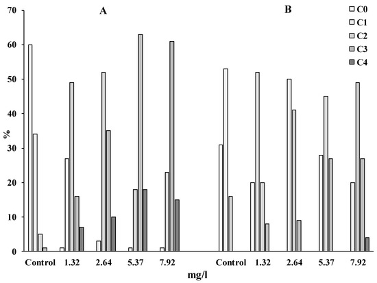 It should be noted that the eggs and spermatozoa of control animals predominantly (85% and 95%, respectively) form comets that belong to the C0 and C1 classes, which are characteristic of intact and slightly damaged viable cells. When exposed to WAF-DF on both types of gametes, comets are formed, predominantly belonging to classes C2, C3 and C4, which indicates a high level of fragmentation of the DNA molecule (Figure 2). This trend is especially pronounced in experiments with sand dollar sperm (Figure 2A). If, in the control groups of sand dollars, sperm with the maximum DNA content in the comet tail (>20%) were no more than 5% of the cells, then after a short exposure to even the minimum concentration of WAF-DF, the proportion of cells with a damaged genome (C2 + C3 + C4) is about 70%. At the same time, it should be noted that with an increase in the concentration of WAF-DF, the number of cells that form comets (C4) of apoptotic nature increases.