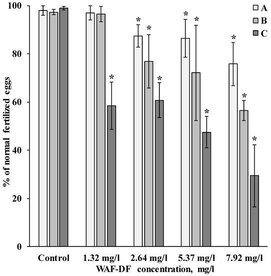 Effect of WAF-DF exposure of different kinds of germ cells on the fertilization of the sand dollar S. mirabilis (A—sperm were exposed to WAF-DF; B—eggs were exposed to WAF-DF; and C—both types of gametes were exposed to WAF-DF (mean ±standard deviation). * Difference from the control is significant (p < 0.05).
