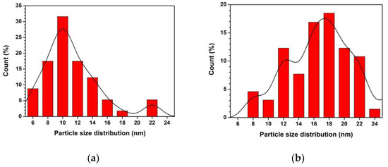 Particle size distribution of (a) ZnO and (b) Ti-ZnO NPs.