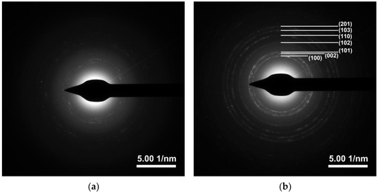 The XRD patterns of ZnO and Ti-ZnO in Figure 5 show the diffraction angles at 2θ of 31.7°, 34.5°, 36.2°, 47.5°, 56.6°, 62.9°, and 68.0° indexed to the crystal planes of (100), (002), (101), (102), (110), (103), and (122), respectively [22,25]. The patterns corresponded well with the hexagonal wurtzite structure of ZnO, according to the standard JCPDS no. 36-1451 [2]. The peak at 2θ~23.5° might be related to the orthorhombic Zn(OH)2 phase (JCPDS no. 01-071-2215). To estimate the crystal sizes of ZnO and Ti-ZnO, the three major peaks, including the (100), (002), and (101) planes, were considered for the calculation using the Debye–Scherrer equation (Equation (1)). The calculated crystal sizes were 12.88 ± 2.33 and 12.81 ± 2.88 nm for ZnO and Ti-ZnO, respectively. The results presented no differences in the average crystal size for ZnO and Ti-ZnO. This can indicate that Ti4+ ions can substitute into Zn2+ sites, because the ionic radius of 0.61 Å for Ti4+ ions is lower than that of 0.74 Å for Zn2+ ions [26]. However, the change in crystal size was not significant for ZnO and Ti-ZnO due to employing the rapid combustion synthesis method. The SAED patterns (Figure 6) displayed the ring patterns for both ZnO and Ti-ZnO implying the polycrystalline structure. This was caused by the limited crystallization due to the short combustion reaction, which caused low crystallization rates and an uncontrollable crystal growth mechanism.