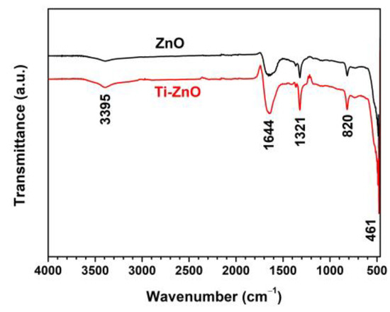 Figure 7 shows the FTIR spectra of ZnO and Ti-ZnO in the range of 4000–450 cm−1 for the examination of the surface chemical structures. The peak at around 461 cm−1, referring to the Zn−O vibration, confirmed the ZnO structure [26,27]. The other peaks were marked as residuals, including organic compounds and water. The peaks at 1321 and 1644 cm−1 were assigned to C−O stretching and C=O stretching vibrations, respectively [22]. The peak at 820 cm−1 was attributed to the OH libration, caused by the Zn(OH)2 phase, and it was consistent with the impurity peak in the XRD results. The peak at 3395 cm−1 was assigned to the stretching vibration of the OH groups.