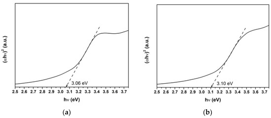 The band gap energy (Eg) for the combustion-synthesized ZnO and Ti-ZnO samples was assessed using the Tauc’s plot relation, as shown in Figure 8. For this purpose, a linear line with the maximum slope was extrapolated to the hν-axis. Then, the Eg value was estimated from the intercept on the hν-axis. It was found that the Eg values for ZnO and Ti-ZnO were 3.06 and 3.10 eV, respectively. However, the Eg values exhibited small differences; the obtained values in this study were lower than those in the literature [2,9,12,28,29], which is due to the low crystallization and the defects [20]. The estimated Eg values were correlated with the UV energy, indicating that ZnO and Ti-ZnO can be used as photocatalysts and activated by UV light.