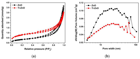 The N2 adsorption–desorption was recorded (Figure 9a) to examine the pore characteristics. The type IV isotherm was similarly observed for both ZnO and Ti-ZnO indicating the mesoporous structure. The H3 hysteresis loop was observed, implying the non-rigid aggregation structures that confirm the cluster-like structure of ZnO and Ti-ZnO. In Figure 9b, the pore width shows a similar pore width distribution. However, the pore widths of 14.75 and 9.12 nm for ZnO and Ti-ZnO, respectively, were estimated using the BJH analysis. SBET was then calculated for the type IV isotherms to estimate the active surface areas of ZnO and Ti-ZnO photocatalysts. The calculated SBET values of 27.84 and 63.85 m2/g for ZnO and Ti-ZnO, respectively, were achieved. The results indicate that Ti-ZnO has a greater active surface area than that of ZnO by over two times, which confirms its suitability for photocatalytic applications.