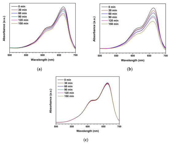 Absorbances of MB under photocatalytic degradation for different UV irradiation time using (a) ZnO photocatalyst, (b) Ti-ZnO photocatalyst, and (c) no photocatalyst.