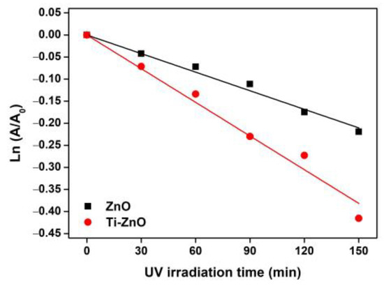 The synthesized ZnO and Ti-ZnO were used as the photocatalysts for photocatalytic degradation of MB under UV activation. The degradation of MB using only a photocatalyst was examined, as shown in Figure S1 (Supplementary Materials). The negligible change in absorbance of MB demonstrates that the photocatalyst had no significant effect on MB without UV light. To further investigate the influence of photocatalytic activity on MB, the experiment was repeated using ZnO and Ti-ZnO photocatalysts under UV light. The absorbance of MB was measured to investigate the degradation performance, as shown in Figure 10. It was observed that the absorbance of MB for both ZnO and Ti-ZnO photocatalysts decreased as a function of the UV irradiation time. The absorbance of MB for Ti-ZnO showed stronger decreasing trends than that for ZnO. This indicates a better photocatalytic activity for Ti-ZnO to degrade MB molecules compared with ZnO. This is correlated with the higher SBET value for Ti-ZnO. It is believed that the high surface areas can provide interaction between electron-hole carriers and surrounding molecules [21,30], whereas, the unchanged absorbance of MB after UV irradiation in the absence of a photocatalyst confirms that the UV light had no effect on MB. In the analysis of MB degradation performance, the degradation rate constant was estimated using pseudo-first-order kinetics. From Equation (3), the ln (A/A0) curve was plotted versus the irradiation time (Figure 11), and the degradation rate constant was calculated by tracking the slopes of the curve. The degradation rate constant values of MB degradation were 1.40 × 10−3 and 2.54 × 10−3 min−1 for ZnO and Ti-ZnO photocatalysts, respectively. The results confirm that Ti-ZnO prepared by combustion has efficient photocatalytic activity for MB degradation, which is consistent with Ti-ZnO prepared by chemical precipitation as described elsewhere [30]. Remarkably, the degradation rate constant for Ti-ZnO increased by over 80% in comparison with ZnO. This result implies that Ti-ZnO improved the kinetic activity of MB degradation under UV illumination. The improved activity is believed to be due to the increased surface area and the reduced pore width. The mechanism of photocatalytic degradation can be briefly described in Equations (4)–(7) [2,31,32]: