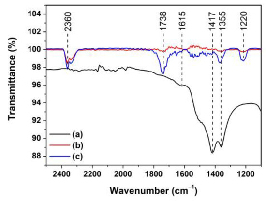 FTIR spectra of (a) initial MB solution; and MB solution after photocatalytic degradation for 150 min using (b) ZnO and (c) Ti-ZnO photocatalysts.