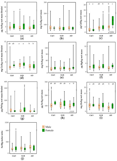 Age group and sex differences in the brain levels of (a) As; (b) Ca; (c) Cd; (d) Cu; (e) Fe; (f) Hg; (g) Pb; (h) Se; (i) Zn; and (j) Se/Hg molar ratios in brown bears from Croatia. Boxes denote interquartile range (IQR), the line in the box is the median, and whiskers denote minimum and maximum values. Significant differences between age groups within the same sex are marked with different letters above the boxes (a,b,c), while for sex differences within one age group, the level of significance is additionally noted below the boxes. C&Y—cubs and yearlings; SUB—subadults; AD—adults.