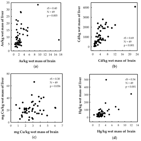 Correlation of (a) As; (b) Cd; (c) Cu; and (d) Hg levels between the brain and the liver of brown bears from Croatia. rS—Spearman correlation coefficient; N—number of individuals; p—level of significance.