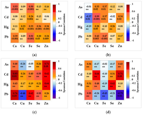 Heatmap of Spearman correlation coefficients between toxic and essential elements in (a) brown bear brain (n = 114); (b) brown bear liver (n = 49); (c) grey wolf brain (n = 8); and (d) grey wolf liver (n = 8) from Croatia. The level of significance is denoted below the coefficient; otherwise, non-significant (ns) symbol is stated.
