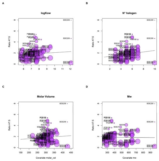Bubble plots representing the associations between the mean partitioning ratios of persistent organic pollutants between adipose tissue and serum reported in the literature and physicochemical properties, including the partition octanol–water (Log Kow, (A)), number of halogen atoms (B), molar volume (C) and molar weight (Mw, (D)).