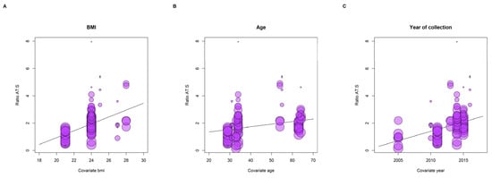 Bubble plots representing the associations between adipose tissue: serum ratios with body mass index (BMI, (A)), age (B), and year of collection (C) from the random effects meta-regression model. The study [52] was excluded from this analysis because the BMI was not reported.