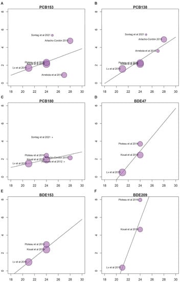 Bubble plots representing the associations between adipose tissue: serum ratios and body mass index (BMI) from the random effects meta-regression model for specific congeners including PCB 153 (A), PCB 138 (B), PCB 180 (C), BDE 47 (D), BDE 153 (E), and BDE 209 (F). The study [52] was excluded from this analysis because the BMI was not reported.