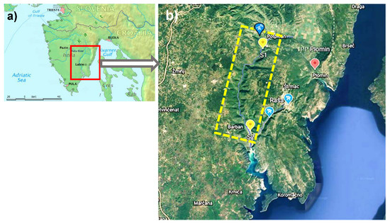 The Raša River and its estuary are located at the southeastern part of the Istrian peninsula, Croatia (Figure 1). The investigated watercourse of the river Raša represents the western and southwestern border of the wider Labin region, known for its rich deposits of superhigh-organic-sulfur coal. The hydrological regime of the river is typically karstic and characterized by short-term high-discharge events. In the upper part of the drainage area, Eocene flysch sediments predominate, while the central part of the drainage area is dominated by the river flow resulting from the confluence of several streams. The valley floor is covered with quaternary alluvial deposits, while the flanks of the valley are composed of upper Cretaceous limestones [12,17]. A detailed overview of the climatic, pedological, geographical, geological and hydrogeological characteristics of the area were presented previously [7,8,10,11,14].