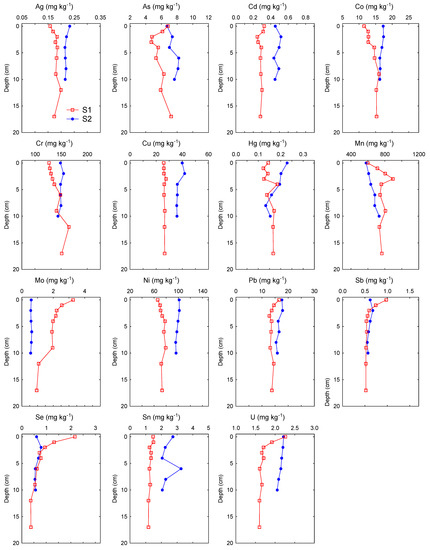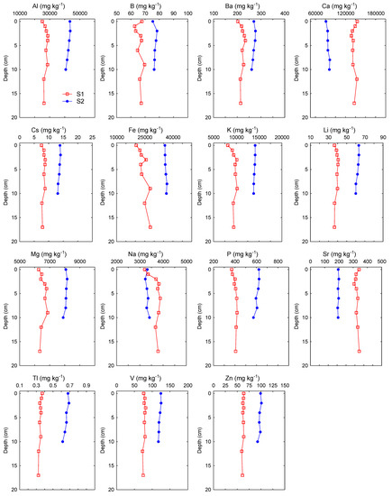 Considering the history of coal mining in the Labin Basin, an area known for long-term mining of coal rich in various inorganic elements (Cd, Cr, Hg, Mo, Pb, Se, U, V) [8,11], we expected that there might be some locational differences in the Raša River sediments, with levels potentially higher at downstream locations close to the confluence of the Raša River and Krapan stream results of the non-parametric statistical tests showed that most of the analyzed elements, except for Cr, Se, Sb and Hg, significantly differed between locations (Table 3). Most of the elements (Al, As, B, Ba, Cd, Co, Cs, Cu, Fe, K, Li, Mg, Ni, P, Pb, Sn, U, V, Tl, Zn) were elevated in the lower course of the river at location S2. In contrast, certain elements of geogenous (lithogenous) origin (Ca, Na, Mn, Mo, Sr) were significantly higher at location S1, located close to the source of the river and Čepić field, where intensive weathering of the source rocks occurs. For all elements at location S2 and most elements at location S1, variability of the concentrations was rather small (0.9–19.9% at location S2; 2.0–14.6% at location S1), indicating relatively constant element levels during the studied period. Higher variations at station S1 were recorded only for Se (25%), P (35%) and Na (65%). The vertical profiles of the elements in the sediment gave us an even better insight into the state of pollution of the analyzed sediments with inorganic elements (Figure 2). The vertical profiles of conservative lithogenic elements (Al, Fe, Li, K) were rather uniform at both locations, indicating a relatively constant terrigenous input. Similarly, a number of other lithogenic (Ba, Ca, Mg, Na, P, Sr) and trace elements (Ag, B, Cd, Cr, Cs, Cu, Ni, Tl, V, Zn) also showed uniform distribution along the depth profiles at both locations, which indicated a predominately geogenic (natural) origin of these elements over the time scale covered by the sediment cores. Only the concentrations of Mo, Sb, Se and U were elevated in the surface layer (0–5 cm) at location S1, and of Hg in the surface layer (0–5 cm) and Sn in subsurface layer (5–7.5 cm) at location S2, indicating a possible anthropogenic influence.
