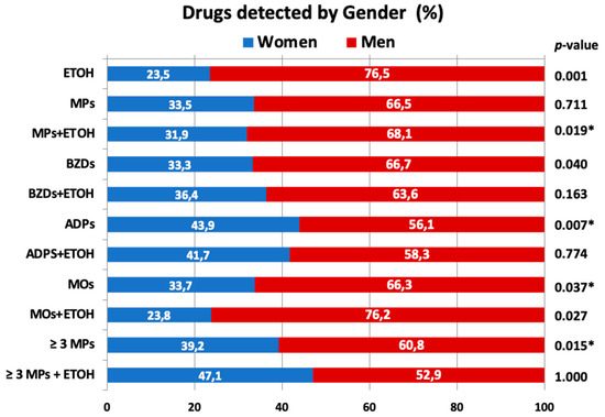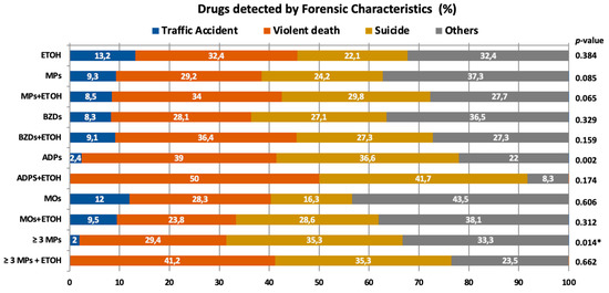 Frequencies (percentages) of group of drugs detected in relation to sociodemographic (top) and forensic characteristics (bottom). ETOH: ethanol; MPs: medical psycothropics; BZDs: benzodiazepines; ADPs: antidepressants; MOs: medical opiates. The asterisk indicates the existence of statistical significance.