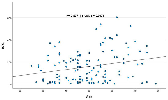 Positive association in whole series among age and blood alcohol concentrations (BAC; g/L). r = 0.237; p = 0.007; Pearson’s linear correlation coefficient.