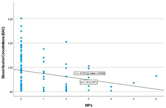 Inverse relationship in men among number of MPs detected and blood alcohol concentrations (BAC; g/L). r = 0.219; p = 0.026, Pearson’s linear correlation coefficient.