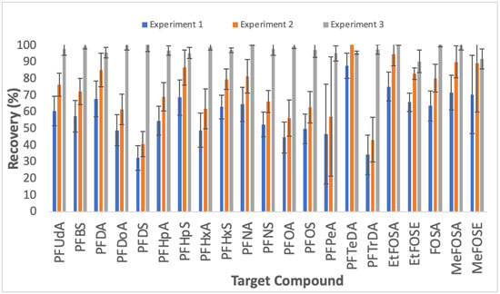 Recoveries of PFAS (all 1 mg/kg) with varying number of extraction cycles (Experiment 1 = 1 cycle; Experiment 2 = 2 cycles; Experiment 3 = 3 cycles).