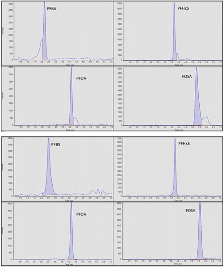 Of the few studies that have determined PFAS in textile samples, there have been different approaches to preparing the extract prior to chemical analysis. One study uses gravimetric filtration through qualitative filter paper [], while another uses SPE clean-up on an ENVI-carb cartridge [], which is regularly used in a variety of methods for the determination of PFAS in various matrices [,,,]. Both can be time-consuming, and the former involves some losses of target compounds, which can increase the limits of quantification. We investigated the effects of syringe filtration on chromatography by performing triplicate measurements of an extract before and after passing through a syringe filter. The use of a syringe filter is a rapid process that will remove any particulate matter and large molecules from the extract within a few seconds. As it is the final step of the procedure it is likely to have a negligible effect on the recoveries of our target PFAS. Figure 2 demonstrates that the use of a syringe filter clearly improved chromatography for several target PFAS compounds by removing interferences producing narrower and more symmetric peaks making identification and integration more straightforward. By eliminating shoulders from the peaks of several compounds, this step also improves the S/N ratio of our target PFAS maximising the sensitivity of the method and optimising LOQs. It was therefore decided that this was a necessary and satisfactory rapid clean-up step for this method.