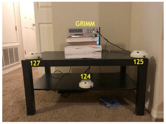 Photograph of AirU and GRIMM configuration for comparison in residential home. The GRIMM (labeled) was placed in an elevated position and the three AirUs (124, 125, 127) were triangulated around it.
