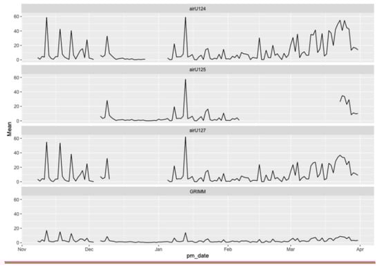 In addition to the pre- and post-calibration analysis described above, a field validation test was conducted to examine differences in performance between the AirUs and reference-grade instrumentation over time. Three AirUs that had not been previously deployed were calibrated and used alongside a GRIMM Aerosol Monitor 1.109 (GRIMM Aerosol Technik GmbH & Co. KG, Ainring, Germany). These instruments were placed in a residential home between 8 November 2018 and 31 March 2019. The GRIMM is a portable laser aerosol spectrometer designed for continuous measurement of airborne particle concentration as well as particle size distribution (with 31 discrete size bins from 0.25 μm to 32 μm). This instrument also has a backup filter that collects all sampled material and can be used for further analysis if desired []. The GRIMM accomplishes its measurements with a light scattering method for single particles using a semiconductor laser, allowing it to detect particles as small as 0.25 μm [].