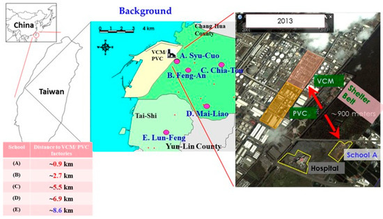 - Chen, C.F.; Chio, C.P.; Yuan, T.H.; Yeh, Y.P.; Chan, C.C. Increased cancer incidence of Changhua residents living in Taisi Village north to the No. 6 Naphtha Cracking Complex. J. Formos. Med. Assoc. 2018, 117, 1101–1107. [Google Scholar] [CrossRef]