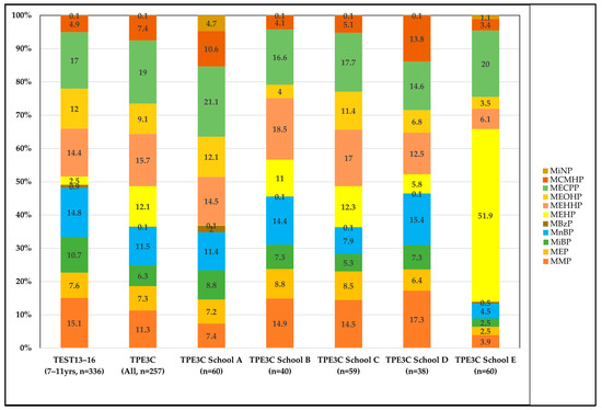 - Wang, B.; Wang, H.; Zhou, W.; Chen, Y.; Zhou, Y.; Jiang, Q. Urinary excretion of phthalate metabolites in school children of China: Implication for cumulative risk assessment of phthalate exposure. Environ. Sci. Technol. 2015, 49, 1120–1129. [Google Scholar] [CrossRef]