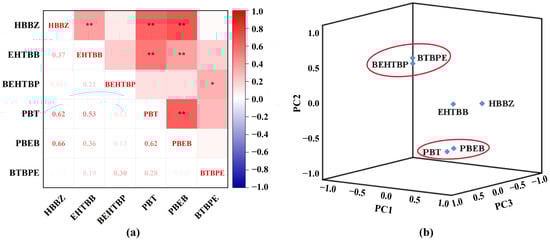Spearman correlation coefficient among concentrations of NBFRs in dust samples from e-waste-dismantling workplace (* p < 0.05; ** p < 0.01) (a), and principal component analysis of NBFRs in dust samples from e-waste-dismantling workplace (PC1, 36.0% variance; PC2, 20.9% variance; PC3, 20.2% variance) (b).