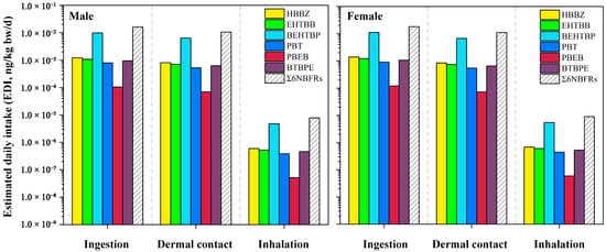 The discussed EDI values in this section were all based on the average exposure scenario. The EDIs of Σ6NBFRs via dust ingestion, inhalation, and dermal contact in DW1 were 1.59 × 10−2 ng/kg bw/d, 7.76 × 10−6 ng/kg bw/d, and 1.05 × 10−2 ng/kg bw/d for male workers, and 1.82 × 10−2 ng/kg bw/d, 8.88 × 10−6 ng/kg bw/d, and 1.10 × 10−2 ng/kg bw/d for female workers under the average exposure scenario, respectively (Figure 4, Tables S6–S8). The mass-based intake rates of ingestion (IRingestion), inhalation (IRinhalation/PEF), and dermal contact (ABS × SA × AF) were 20 mg/d, 9.79 × 10−3 mg/d, and 12.1–13.2 mg/d, respectively; thus, the calculated EDI value of dust ingestion was estimated to be higher than inhalation and dermal contact accordingly. Among the studied NBFRs, the exposure values of BEHTBP via dust ingestion (male, 3.32 × 10−2 ng/kg bw/d; female, 3.80 × 10−2 ng/kg bw/d) were estimated to be higher than those via inhalation (male, 1.62 × 10−5 ng/kg bw/d; female, 1.86 × 10−5 ng/kg bw/d) and dermal contact (male, 2.20 × 10−2 ng/kg bw/d; female, 2.30 × 10−2 ng/kg bw/d). Therefore, dust ingestion was the main exposure pathway of NBFRs among the three studied pathways.