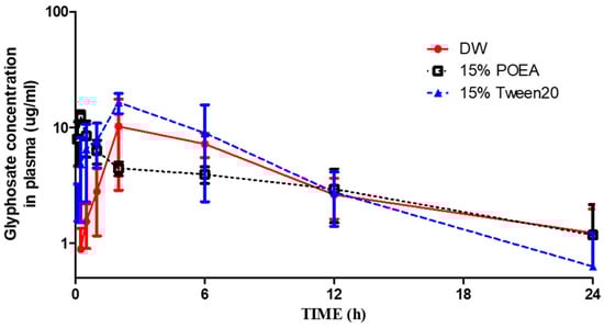 Average plasma concentration–time profiles of glyphosate in DW, 15% POEA and 15% Tween 20 groups to rats (50 mg/kg, P.O.) (n = 5).