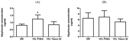 Glyphosate concentration in liver (A) and kidney (B) of DW, 15% POEA and 15% tween 20 groups for rats (*: p < 0.05).